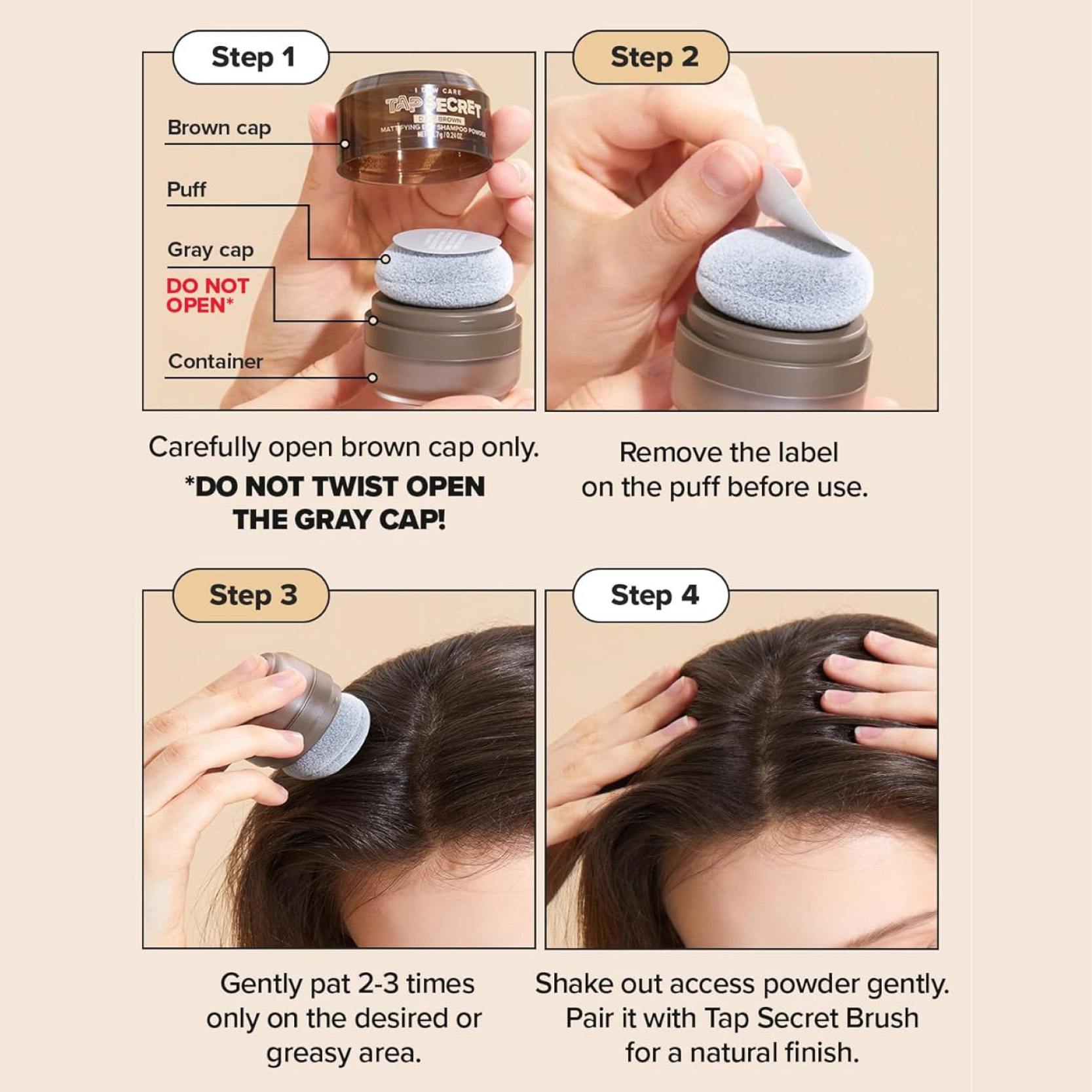 The dry shampoo comes in a fine powder form specifically suited for dark hair, stored in a small container and accompanied by a soft sponge for precise application.